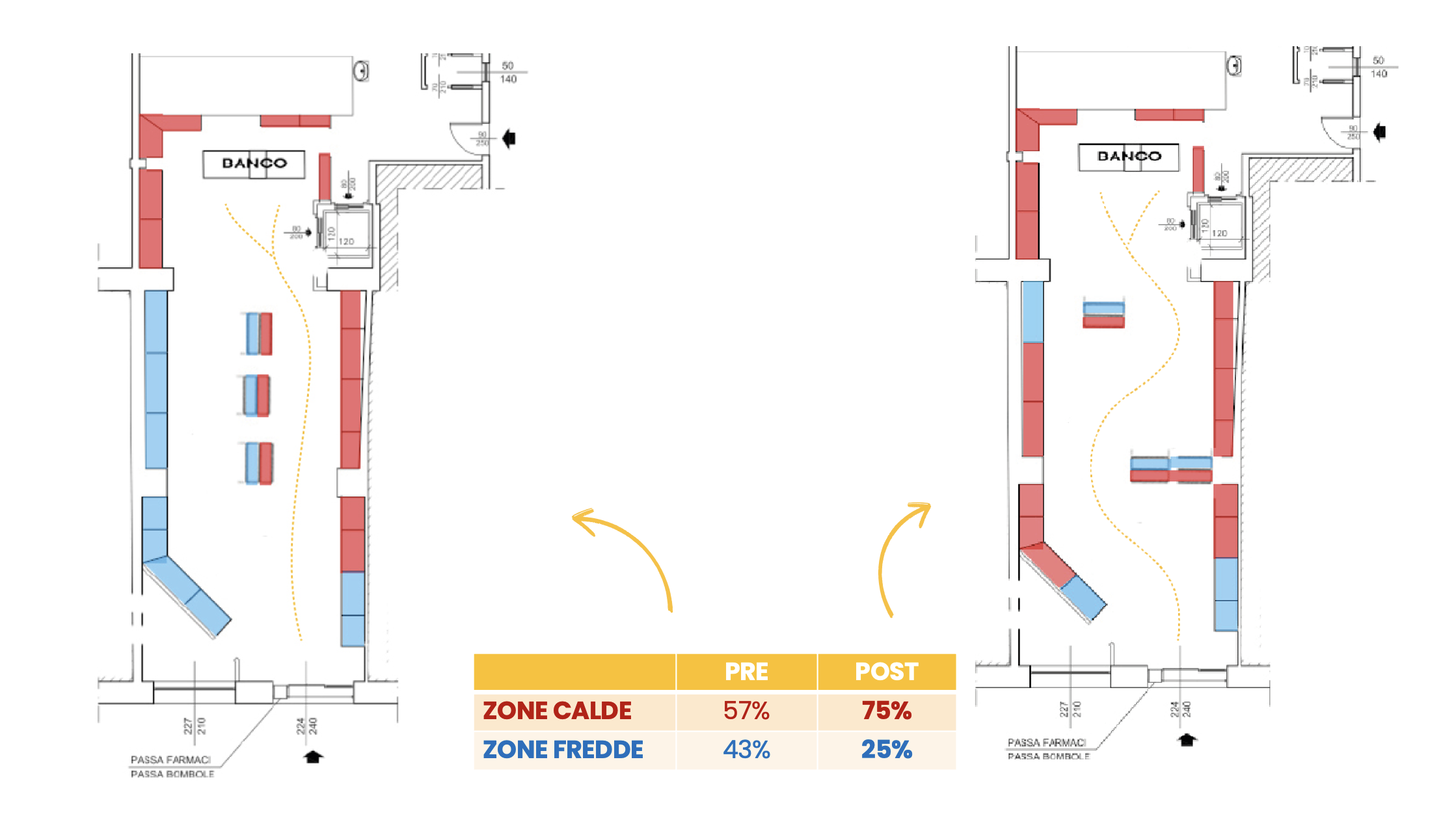Studiamo e realizziamo percorsi in farmacia con l’obiettivo di aumentare le aree calde e di distribuire lo spazio tra le categorie in funzione del peso e della contribuzione al margine e al fatturato.